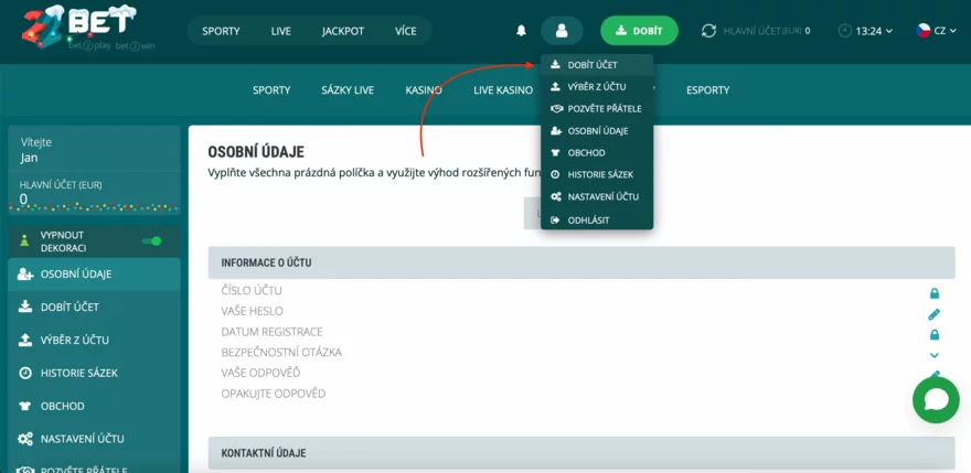 V horním panelu najdete tlačítko Dobít, nebo můžete vybrat možnost Dobiít účet ve svém účtu.