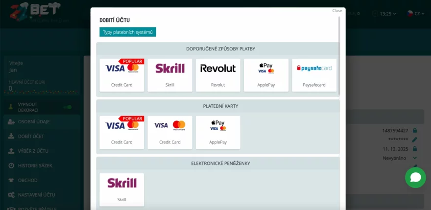 | Jeton, Payeer | e-wallets / alternativní metody | od 50–100 Kč | okamžitě |