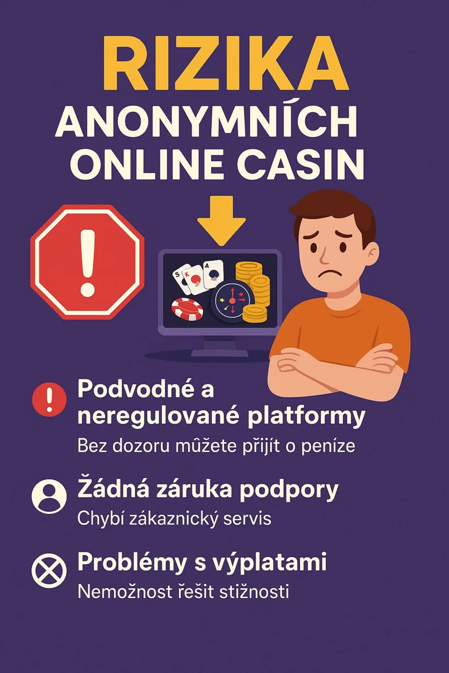 I když hraní v anonymních online casinech zní lákavě, má i svá úskalí. Největší hrozbou jsou podvodné nebo neregulované platformy, které se nemusí řídit žádnými pravidly. A když není žádný dohled, může to snadno skončit tím, že přijdete o peníze – a nikdo vám nepomůže.