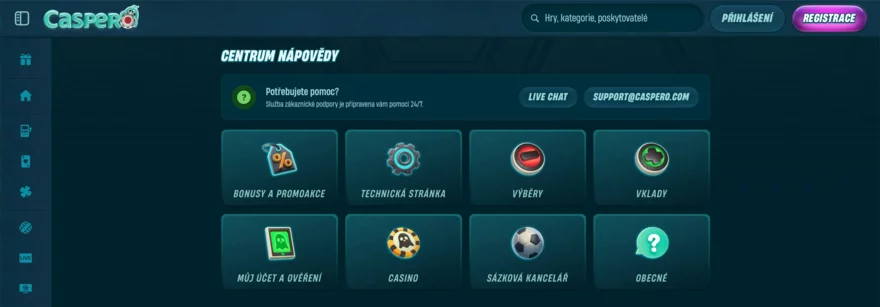 Zákaznický servis Caspera je dostupný 24/7, takže pomoc máte na dosah kdykoli ji potřebujete. Nejrychleji se spojíte přes live chat přímo na webu, kde operátoři reagují během pár minut a komunikují vstřícně. K dispozici je také e-mailová podpora (support@caspero.com) pro složitější dotazy – odpověď obvykle dorazí v řádu hodin. Telefonická linka chybí, ale díky nonstop chatu to nepředstavuje problém. Výhodou pro české hráče je možnost komunikace v českém jazyce (byť ne vždy 24/7), což výrazně usnadňuje řešení problémů. Celkově je podpora hodnocena velmi dobře – personál je profesionální, ochotný a snaží se najít řešení každého požadavku.