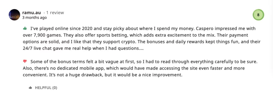 Caspero Casino má mezi hráči převážně pozitivní reputaci. Uživatelé chválí rychlý web, široký katalog her a vstřícnou zákaznickou podporu. Menší výtky se týkají delších výplat o víkendech, ale žádné zásadní stížnosti hráčů se neobjevují.