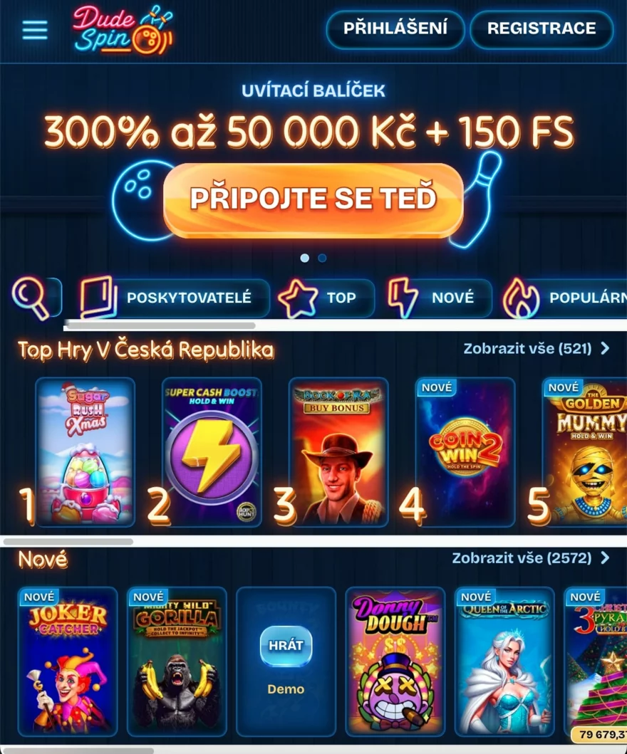 Stránky DudeSpin působí velmi svěže: barevné retro rozhraní s neonovými prvky a bowlingovou tématikou vás doslova vtáhne do hry. Uživatelské rozhraní je přehledné a moderní. V horním menu najdete rychlý přístup k výše zmíněným sekcím a u každé hry vidíte informace jako RTP či výherní automaty podle funkcí. Filtry podle poskytovatele (Pragmatic Play, NetEnt, Play’n GO, Evolution aj.) a žánru usnadňují orientaci v rozsáhlé knihovně. Rozhraní je rychlé a nenáročné, a podporuje plynulé hraní bez sekání či prodlev.