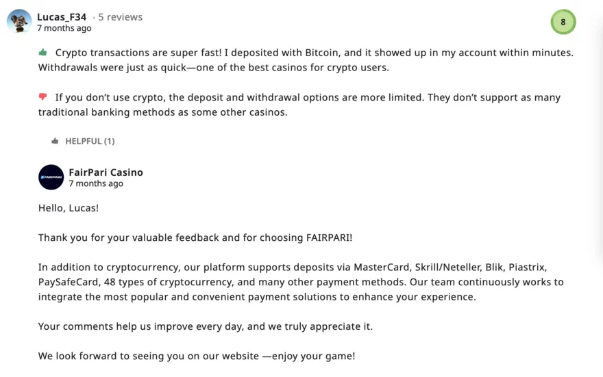 Zkušenosti hráčů bývají převážně pozitivní, i když se mohou objevit stížnosti hráčů na omezení výběrů při nesplnění podmínek. FairPari reaguje na dotazy a vede centrum pro řešení stížností, takže komunikace je rychlá a věcná. Vyhýbá se praktikám vedoucím k černé listině, a pokud nastane spor, podpora vysvětlí postup krok za krokem.Klíčové je dodržet smluvní podmínky, zejména protočení, maximální sázku a verifikaci – pak je proces bez komplikací.