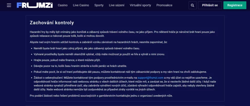 Není to sice tak propracované jako u českých licencovaných kasin, která mají přímé napojení na centrální registry hráčů, ale Frumzi poskytuje minimálně základní nástroje, které mohou pomoci udržet hru pod kontrolou. Hráče upozorňuje na rizika závislosti a doporučuje kontaktovat odborné organizace, pokud mají pocit, že ztrácí kontrolu nad hraním.