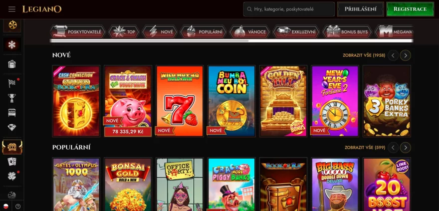 Automaty v Legiano casinu vás uvítají v moderní lobby s přehlednou strukturou. Hned na hlavní stránce casina najdete rozcestník kategorií jako Top, Nové, Populární, Exkluzivní nebo Bonus Buy sloty – to vše pro rychlou orientaci. Celkem je k dispozici více než 9 000 her od desítek vývojářů, takže je opravdu z čeho vybírat. Nechybí ani vyhledávací pole, kde stačí zadat název hry nebo poskytovatele a ihned najdete, co hledáte.