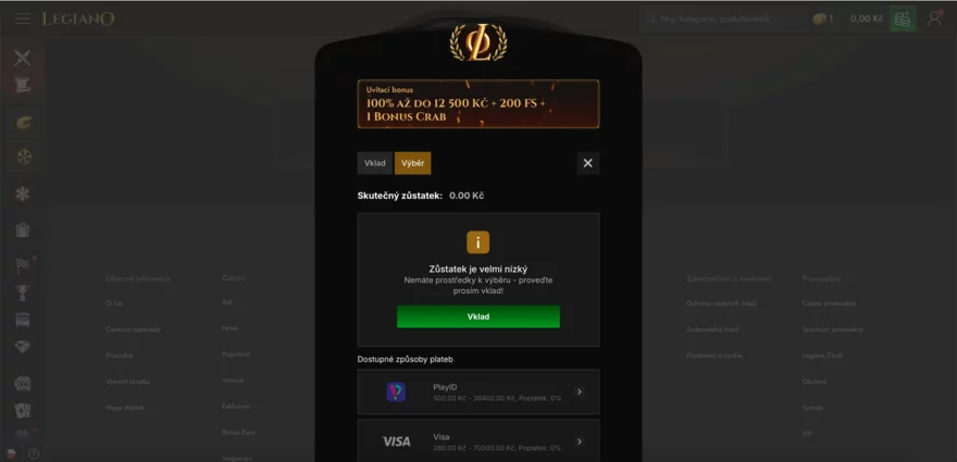 Přihlaste se do casina Legiano a v menu svého účtu vyberte záložku „Výběr“. Zobrazí se seznam dostupných platebních metod.