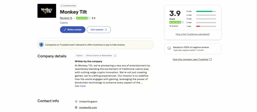 Monkey Tilt klade důraz i na odpovědné hraní. Hráčům nabízí celou řadu nástrojů – nastavení vkladových limitů, ztrátových limitů, časových a sázkových limitů či možnost self-exclusion (automatického vyloučení). Na stránce casina najdete odkazy na organizace pomáhající s problémovým hraním (např. Gamblers Anonymous). Hráčské recenze, hodnocení a stížnosti týkající se jejich zkušeností s Monkey Tilt Casino, jsou převážně pozitivní. Na webu Trustpilot má casino hodnocení 3.9/5, a na AskGamblers si vysloužilo Casino Rank 5.2/10, což odpovídá faktu, že casino je celkově spolehlivé, ale občas se vyskytnou problémy s výběry výher. Recenzenti si nejvíce pochvalují výhodné bonusy i férový přístup. Celkově tedy projekt působí důvěryhodně díky osobní angažovanosti zakladatele a předním ambasadorům (jako je boxer Ryan García).