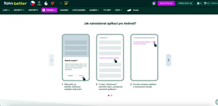 Pro Android zařízení je nutné stáhnout Spinbetter APK soubor a manuálně jej nainstalovat. Nemusíte se toho bát – postup je jednoduchý a zvládne ho i začátečník. Stačí povolit instalaci z neznámých zdrojů a během pár kroků bude appka funkční: