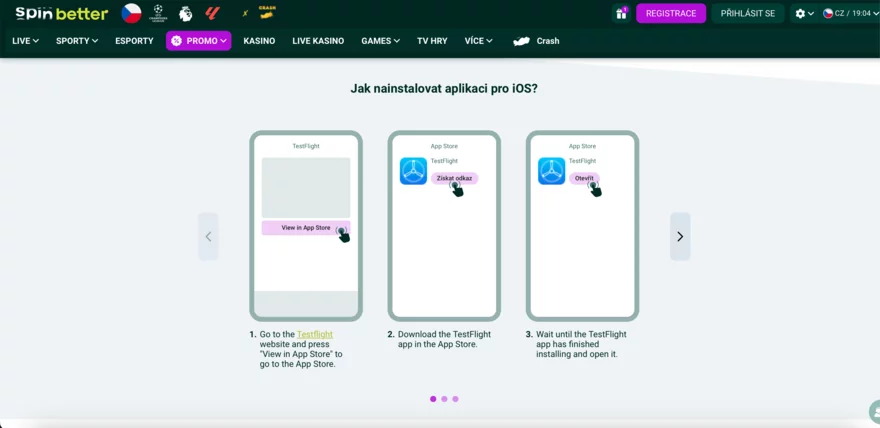 Uživatelé zařízení iPhone a iPad mají k dispozici plnohodnotnou Spinbetter mobilní aplikaci, která se instaluje prostřednictvím Apple TestFlight. Nejde o webovou verzi ani PWA, ale o oficiální nativní aplikaci Spinbetter pro iOS, která splňuje pravidla Apple pro distribuci gambling aplikací. Postup instalace je jednoduchý:
