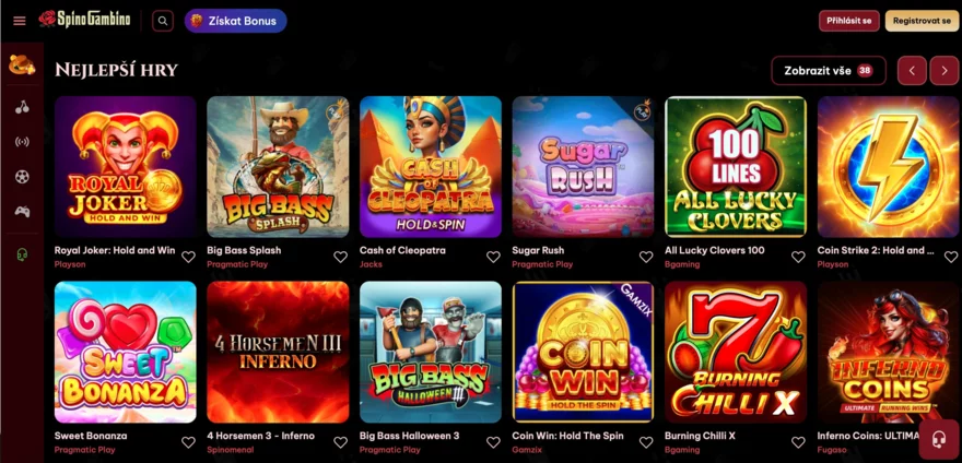 Herní knihovna SpinoGambino je obrovská – najdete tu přes 6000 různých her od desítek softwarových studií. Nechybí populární výherní automaty, progresivní jackpotové sloty s obřími výhrami i moderní Bonus Buy automaty s možností koupě bonusové hry. Velkým plusem je pestrost poskytovatelů – najdete zde hry od renomovaných firem jako NetEnt, Pragmatic Play či Evolution Gaming, což je záruka kvality. Většinu automatů si můžete zkusit i v demo režimu zdarma, takže si je osaháte bez rizika.