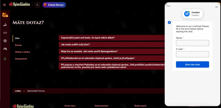 Zákaznická podpora SpinoGambino je k dispozici 24 hodin denně, 7 dní v týdnu. Nejrychleji ji kontaktujete přes live chat přímo na webu, kde odpověď obdržíte obvykle během pár minut. Další možností je e-mailová podpora na adrese support@spinogambino.com, kam můžete směřovat složitější dotazy či podklady. Telefonická linka k dispozici není, ale online chat bohatě postačuje ve většině situací.