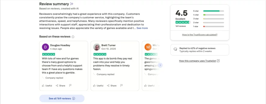 Jelikož jde o poměrně nové casino (založeno 2025), zatím se nestihlo objevit mnoho hráčských recenzí. Doposud však převládají pozitivní zkušenosti – hráči oceňují rychlé výplaty výher, širokou nabídku her i vstřícnou podporu. Například web Trustpilot shrnuje recenze, hodnocení a osobní zkušenosti hráčů s kasinem SpinoGambino. Zde si SpinoGambino vysloužilo skvělé hodnocení 4.5/5. Žádné zásadní kauzy nebo problémy na fórech nekolují, což zvyšuje důvěryhodnost provozovatele. Mírnou nevýhodou je absence nezávislého dohledu, ale SpinoGambino se snaží řešit případné stížnostiinterně a udržovat si dobrou pověst mezi hráči.