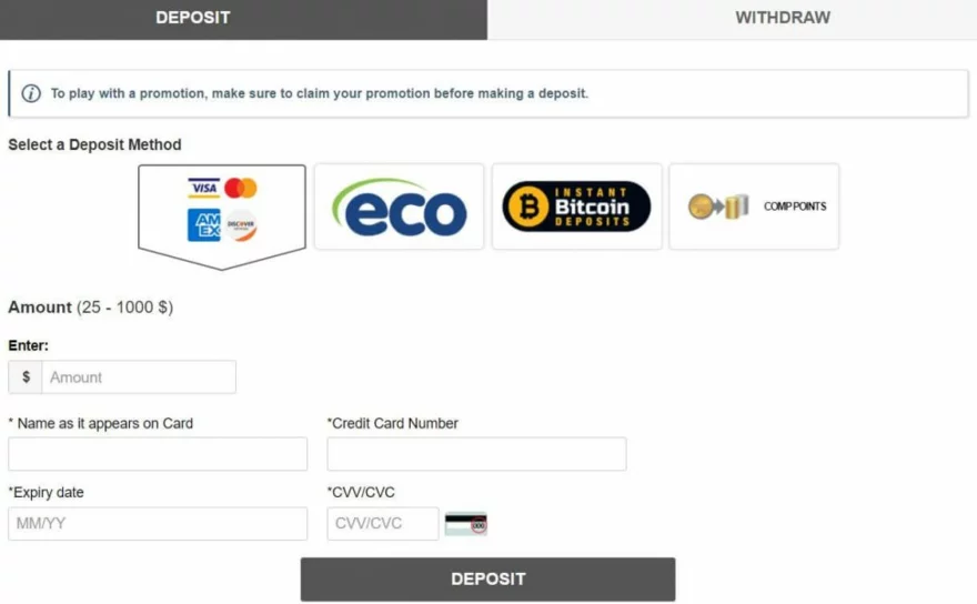 Do tohoto online casina nemůžete vložit „kačku“ na otestování, jestli všechno funguje, jak má. Minimální vklad totiž činí 25 €. To je trochu hodně, když si uvědomíte, že většina casin má spodní limit 20 € (např. Gunsbet, Woocasino), případně méně, někdy i 10 € (např. Genesis Casino, King Billy) Horní hranici vkladu se nám nepodařilo zjistit.