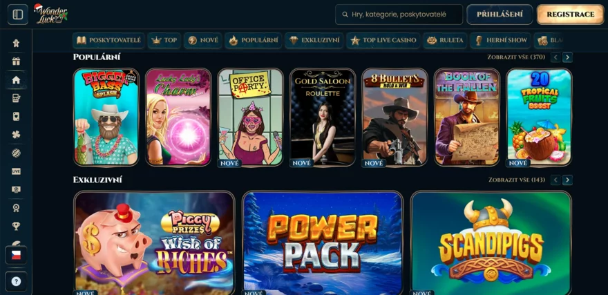 WonderLuck se pyšní rozmanitou nabídkou her od desítek předních poskytovatelů softwaru (například NetEnt, Play’n GO, Pragmatic Play nebo Evolution). Najdete zde klasické výherní automaty i retro sloty, moderní megaways sloty a hry s možností bonus buy. Nechybí ani jackpotové hry se šancí na velké výhry, karetní hry (ruleta, blackjack, poker) a další stolní tituly. Fanoušky živých her potěší bohatý výběr reálných variant – ruleta, baccarat, poker či zábavné herní show s živými krupiéry v reálném čase. Celkově WonderLuck nabízí více než 10 000 her, včetně pravidelných turnajů a speciálních herních pořadů.