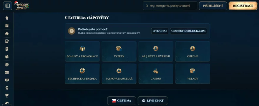 Pojďme se podívat na možnosti kontaktování zákaznické podpory, její dostupnost a kvalitu poskytovaných služeb. WonderLuck nabízí podporu 24/7, na kterou se můžete obrátit pomocí živého chatu či emailu (cs@wonderluck.com). Živý chat je obvykle dostupný okamžitě a operátoři reagují během několika minut. K dispozici je také FAQ sekce, která poskytuje odpovědi na nejčastější dotazy týkající se kasina WonderLuck. Nechybí ani Help Centre na webu, kde najdete odpovědi na nejčastější dotazy týkající se účtu, bonusů či technických problémů. V případě potřeby je možné poslat detailní dotaz na email, na který obvykle odpoví do 24 hodin.