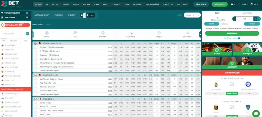 Live sázení u 22Bet je jako být přímo na hřišti – cítíte každý pohyb, každý gól a každé rozhodnutí. Platforma nabízí promyšlené live sázky s rychlými aktualizacemi kurzů a širokou nabídkou sportů, na které můžete sázet v reálném čase. Ať už jde o fotbal, hokej, tenis nebo basketbal, nebo méně tradiční sporty jako stolní tenis nebo MMA, 22Bet vás nenechá vynechat žádný důležitý moment.