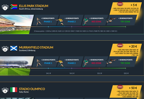 Celkem vás čeká 8 stadionů. V každém stadionu musíte proběhnout 4 fáze (Phrase 1, Phrase 2, Red Zone, Try Zone). Mimochodem online casino Webbyslot si tyto stadiony nevycucalo z prstu. Jsou to reálné objekty, kde dodnes probíhá řada slavných zápasů.